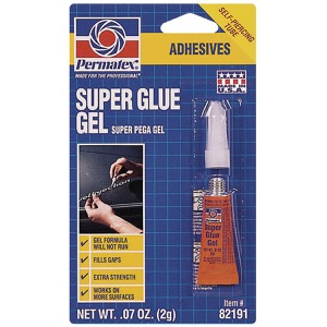 Permatex Super Glue Gel's no drip gel formula stays put for precise application on hard-to-reach, overhead, or vertical surfaces. This permanent, transparent bond is easily applied and works on both porous and nonporous materials including metal, rubber, glass, aluminum, vinyl, ceramics, alloys, and plastics. Fills gaps to .004 in.