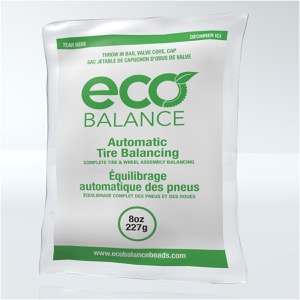 EcoBalance beads work by the beads being distributed in the tire as it begins to roll, through centrifugal force. As the centrifugal force increases, the heavy spot pulls up and down on the suspension, making the beads move in the opposite direction of the downward and upward motion, through inertia. The beads continue to migrate until the complete wheel assembly is balanced.